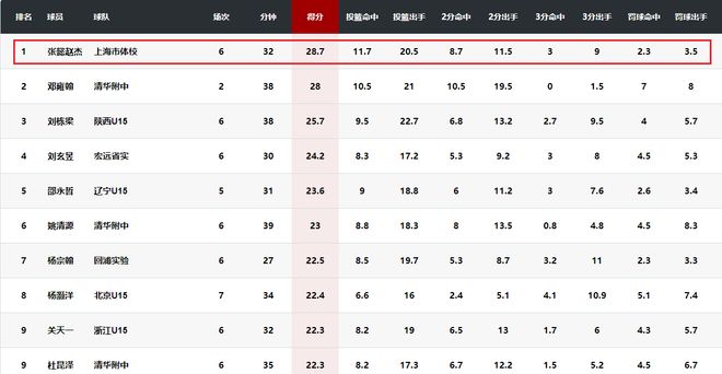 在这届赛事中,张懿赵杰场均得到28.7分10.2篮板3.7助攻2.5抢断1.2盖帽,投篮命中率56.9%,三分命中率33.3%,罚球命中率66.7%。他的场均得分排名这届赛事第一,加冕了得分王。