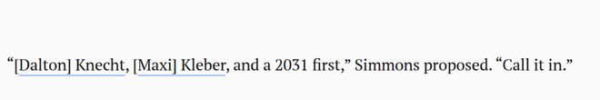 那么湖人要送出怎样的报价才能打动鹈鹕?名嘴比尔-西蒙斯在播客节目上表示:用克内克特、克勒贝尔、再加上一个2031年的首轮签,” 西蒙斯建议道,“就这么报价。”